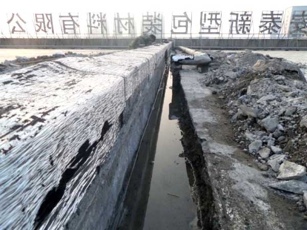 1、基层清理:将伸缩缝外部打开,对基层表面进行清理,对伸缩缝漏水点使用纳米粉进行填堵,并将尘土杂物彻底清扫干净。待基层无明水干燥时,将三元乙丙橡胶防水卷材铺设在伸缩缝里。基层施工完成后将石块回填。
